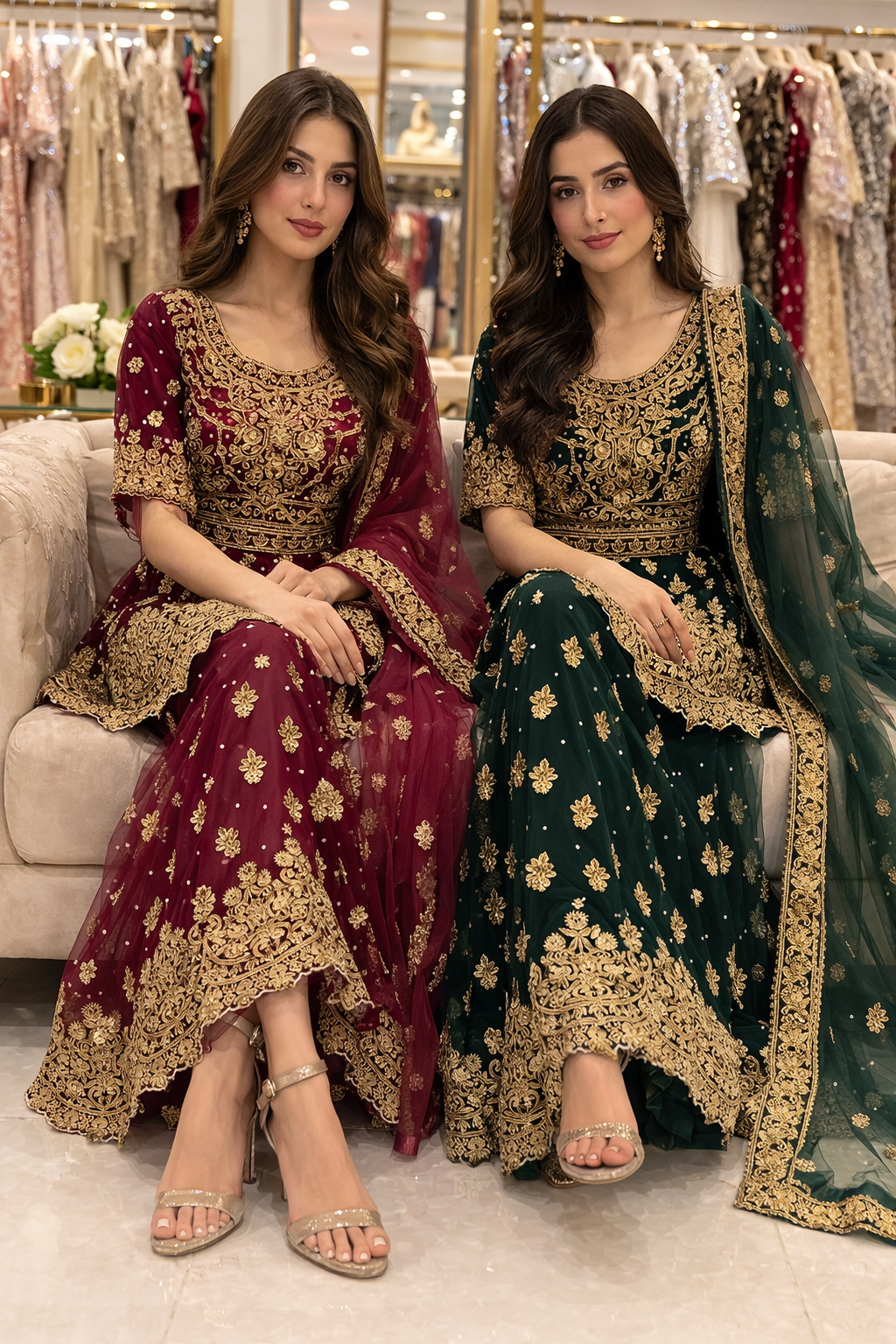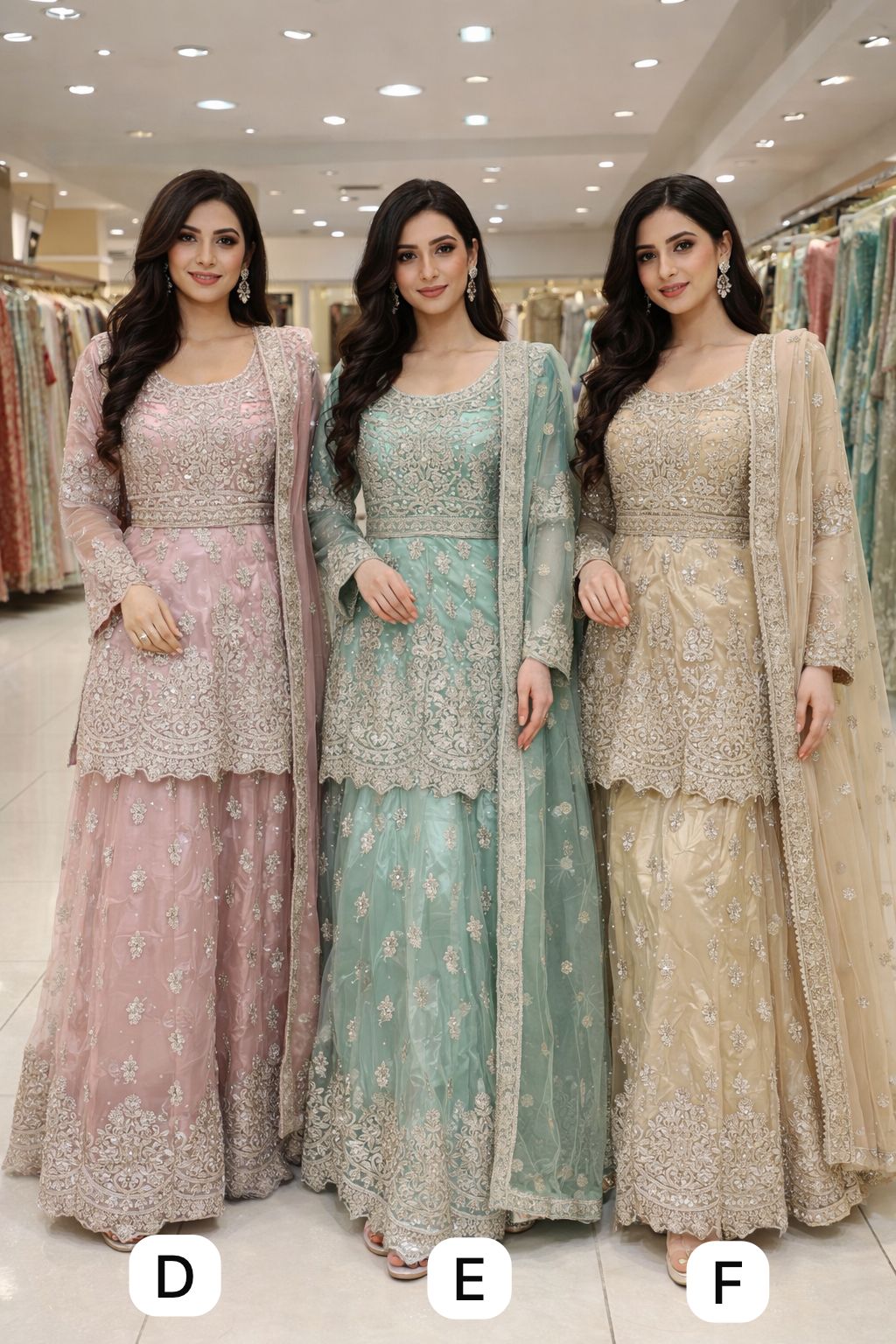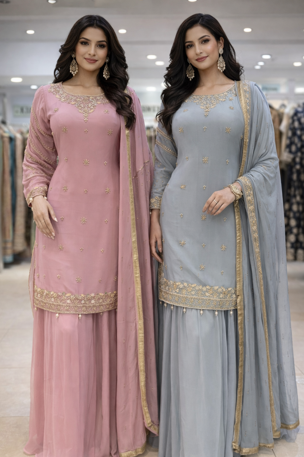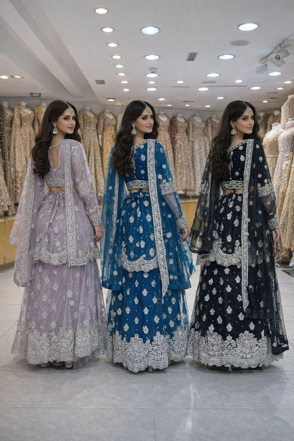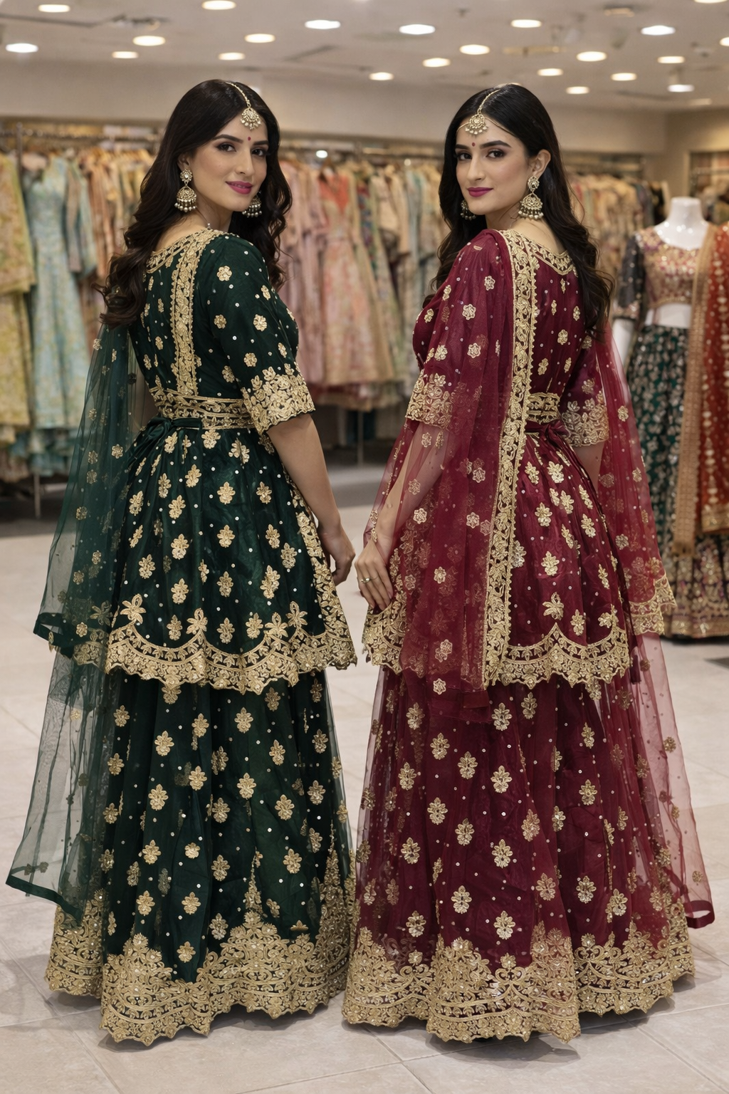 Elegant lehangha dresses with lightweight chiffon fabric with matching dupattas. They feature beautifully handcrafted embroidery with delicate gold accents, adding a touch of sophistication to any special occasion.