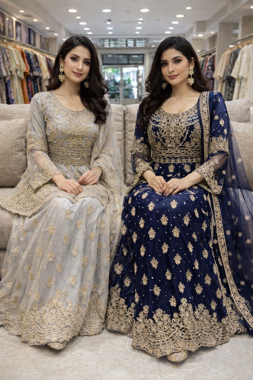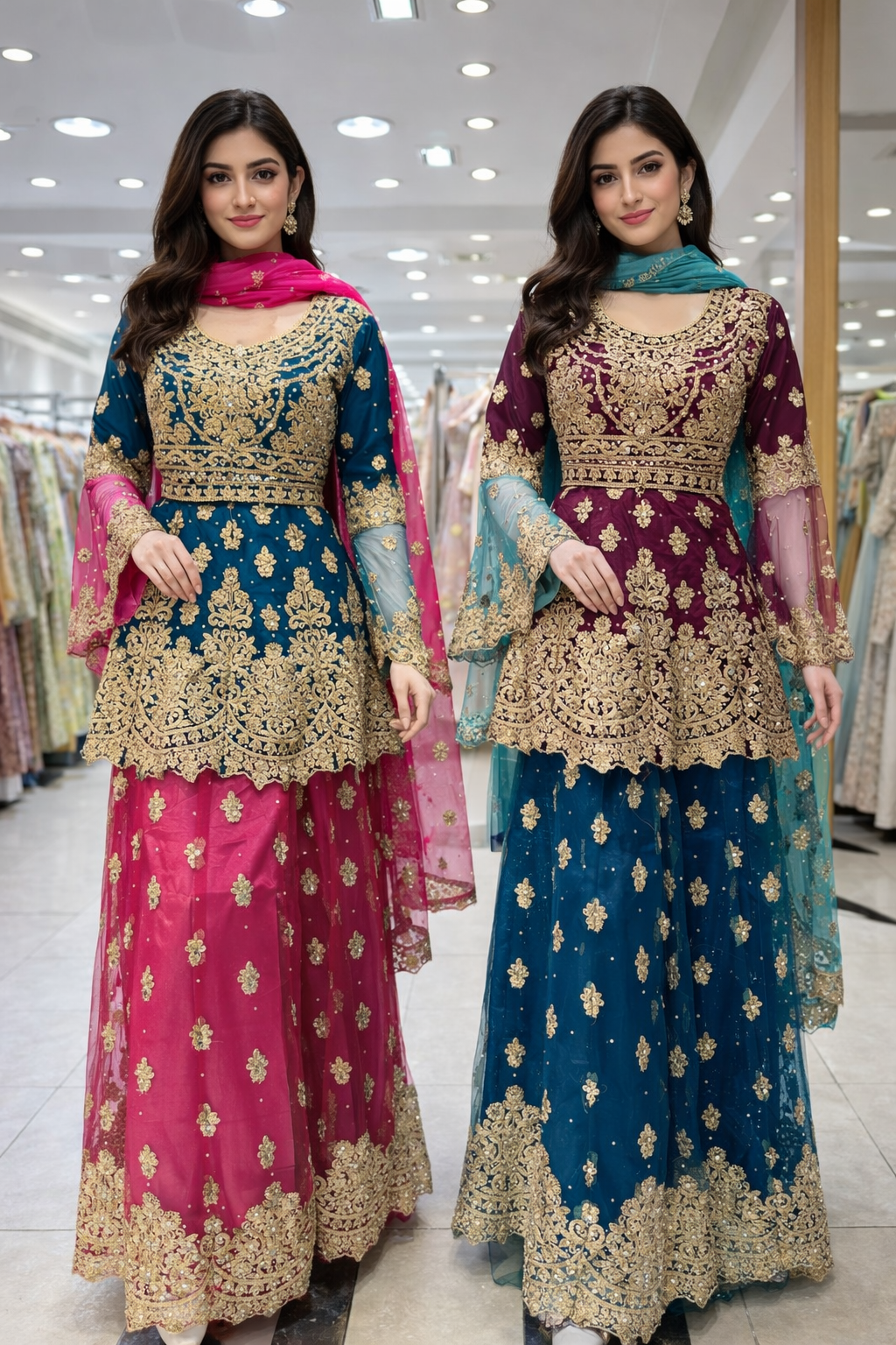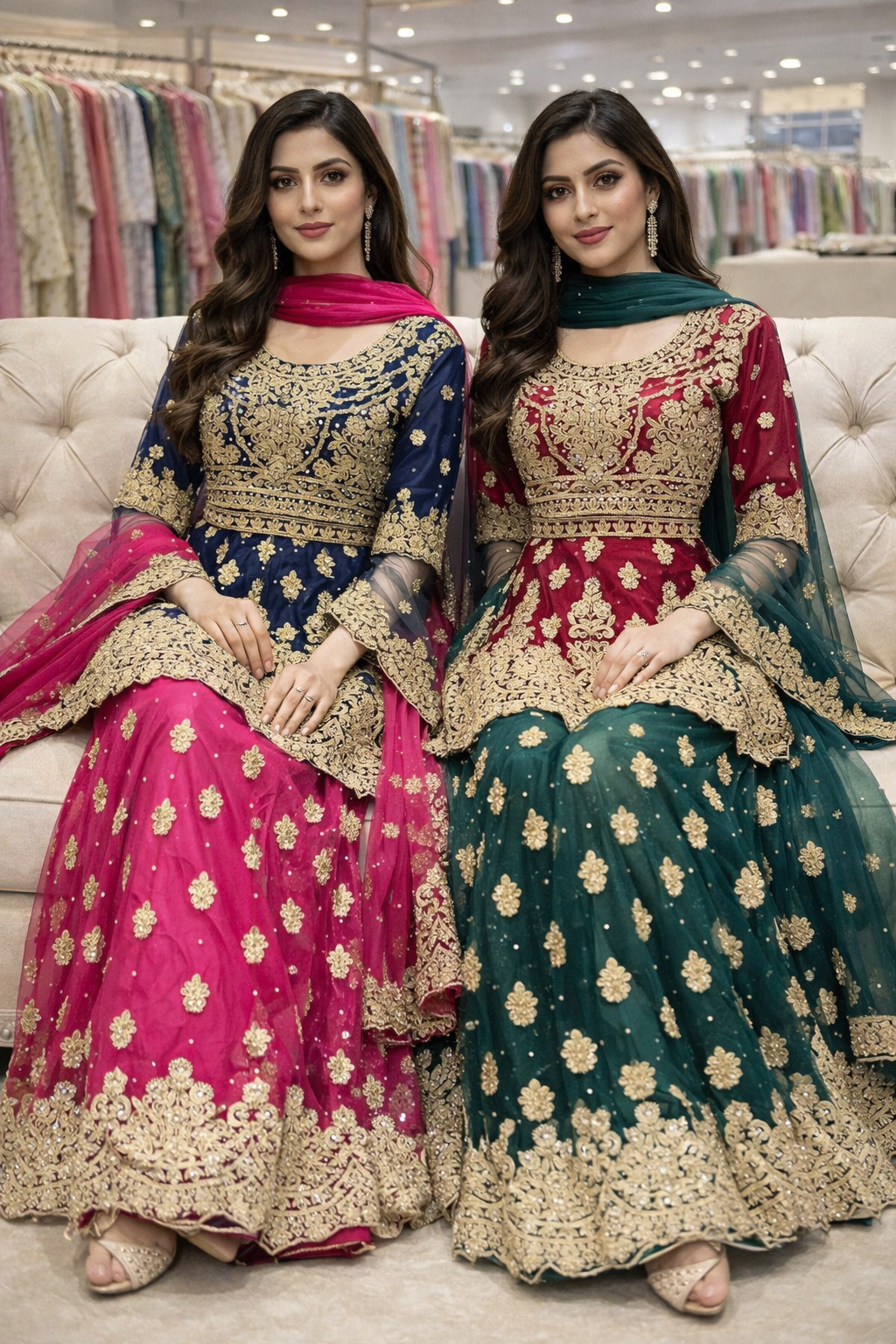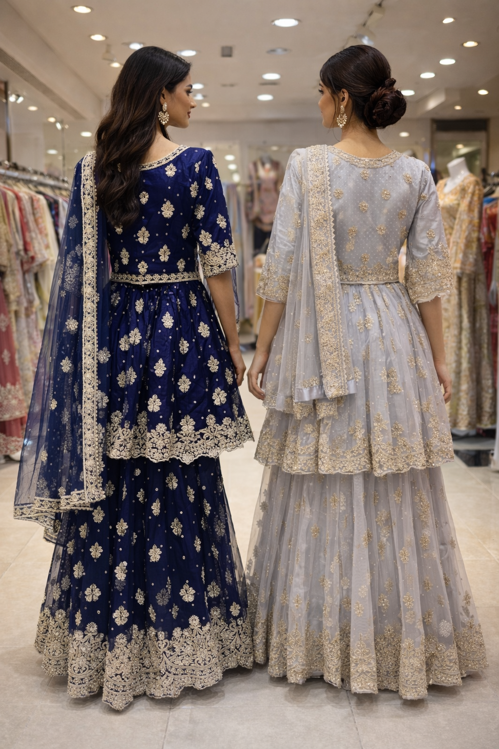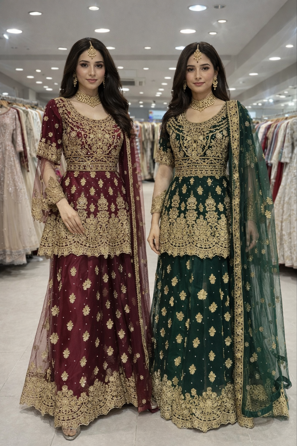 Elegant lehangha dresses with lightweight chiffon fabric with matching dupattas. They feature beautifully handcrafted embroidery with delicate gold accents, adding a touch of sophistication to any special occasion.
