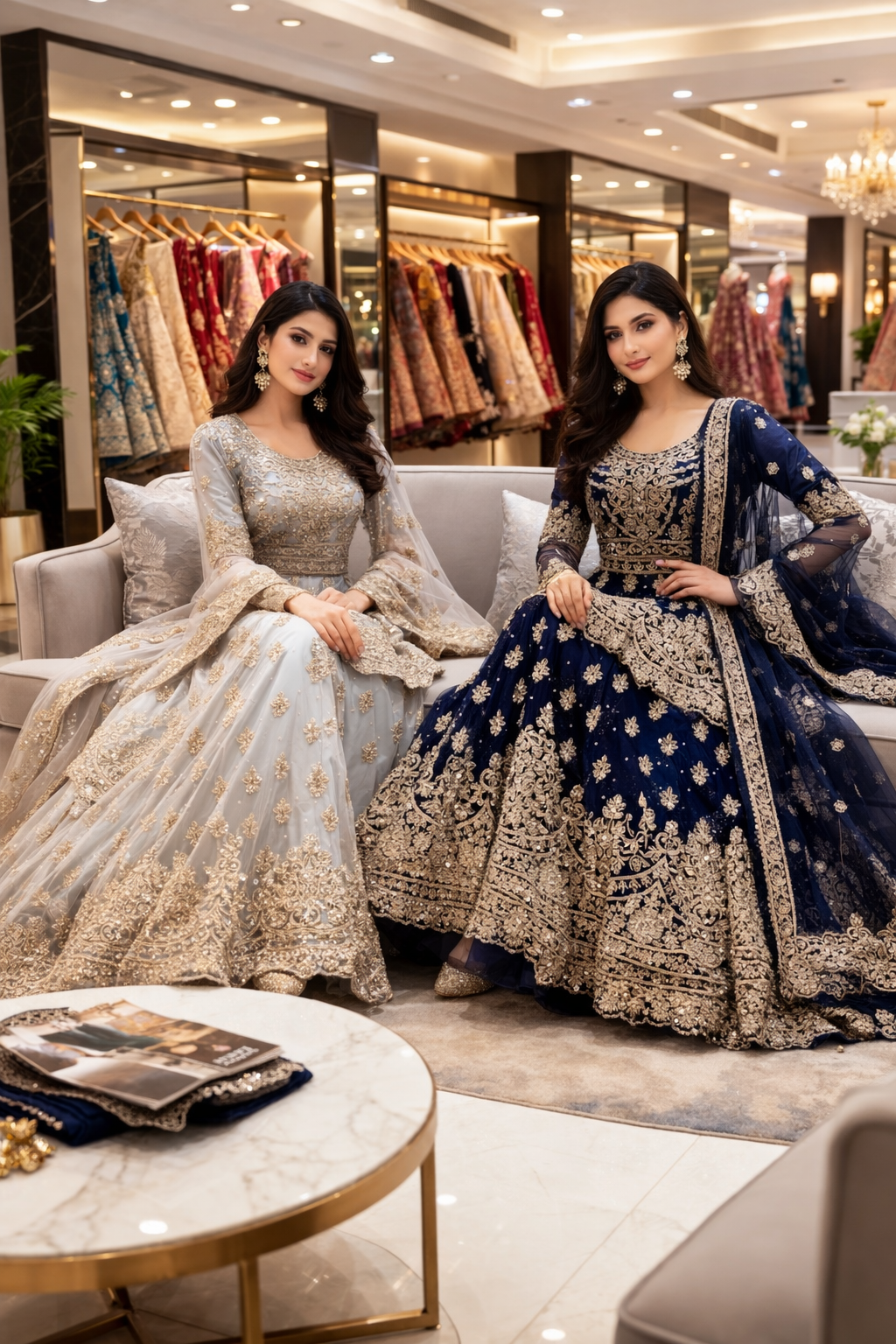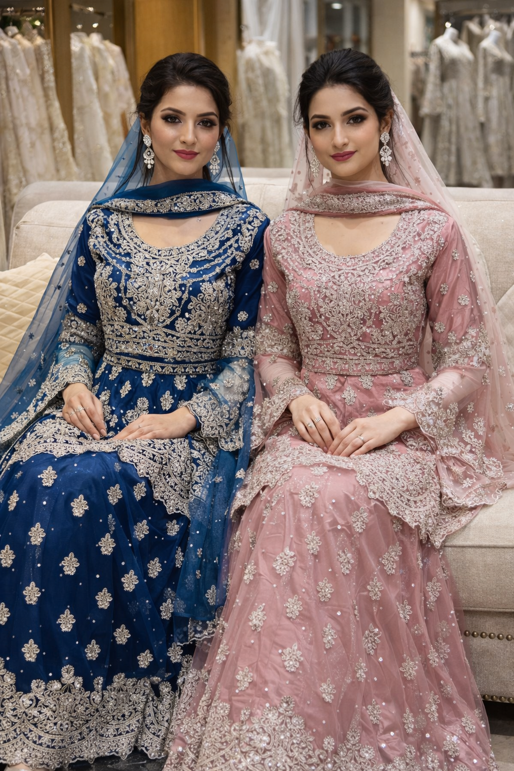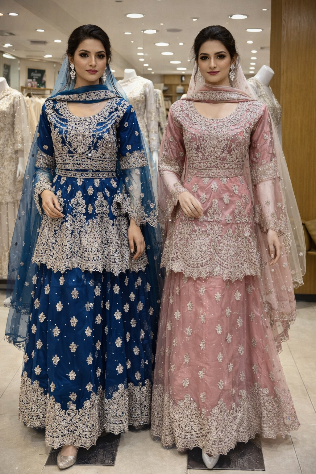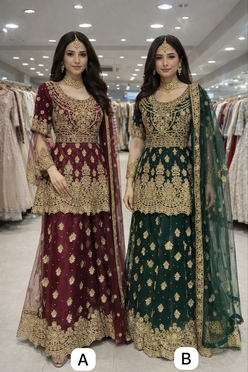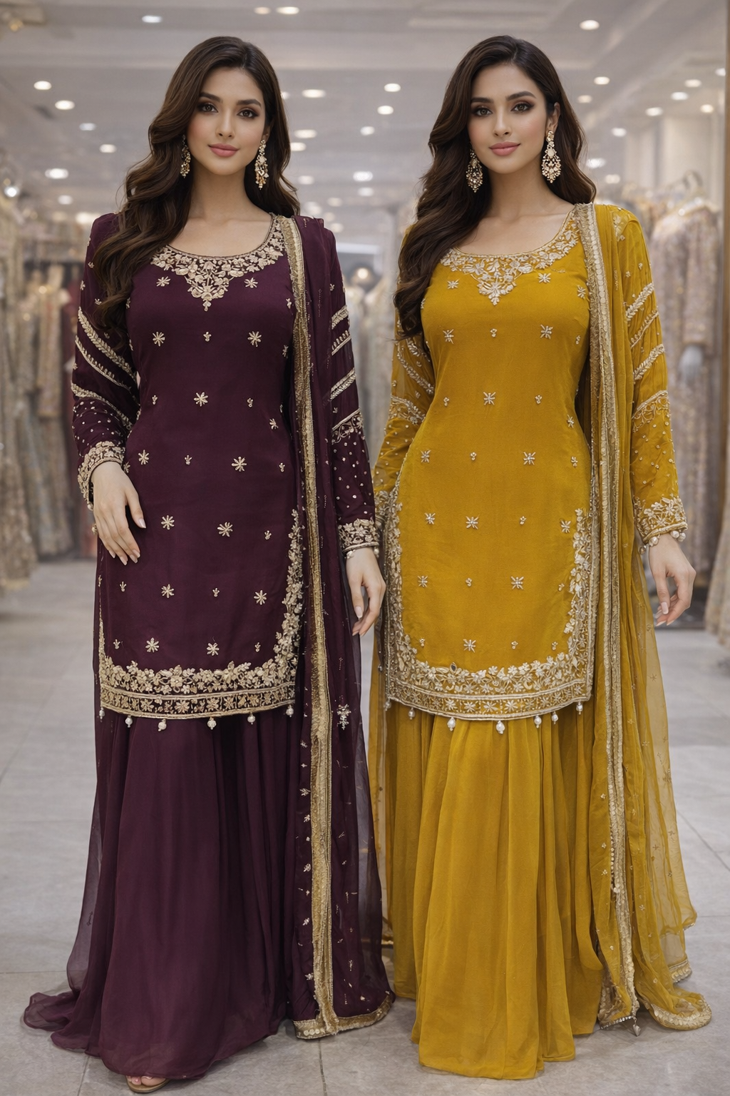 Elegant lehangha dresses with lightweight chiffon fabric with matching dupattas. They feature beautifully handcrafted embroidery with delicate gold accents, adding a touch of sophistication to any special occasion.