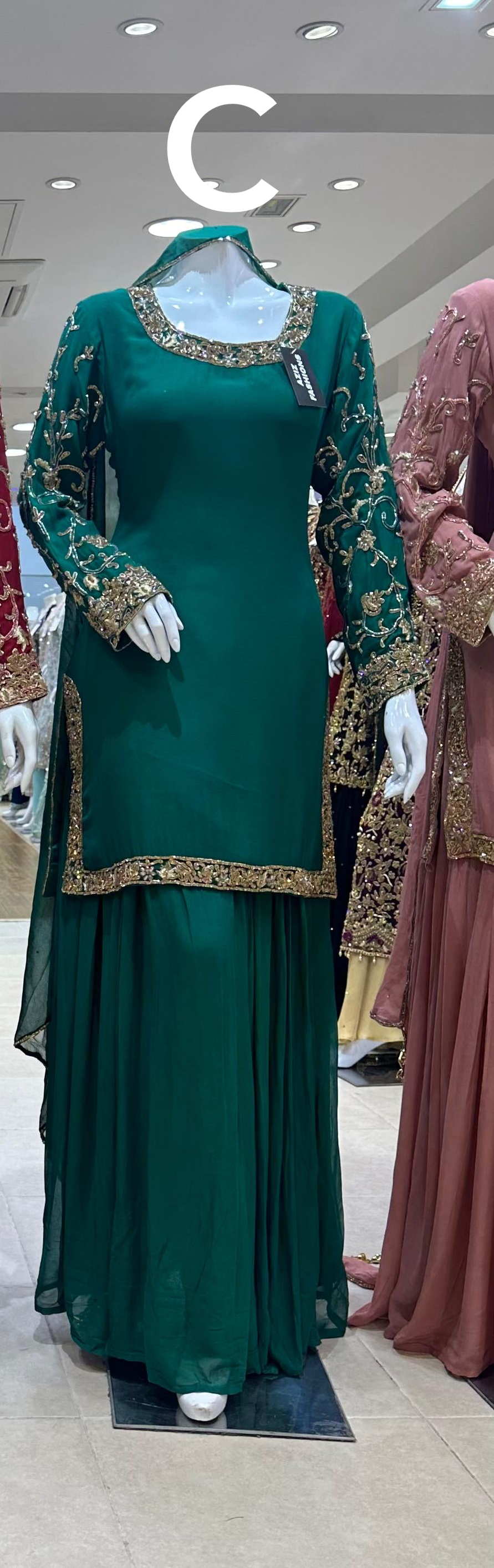 Gold embroidery with sequence mirror and stone work.