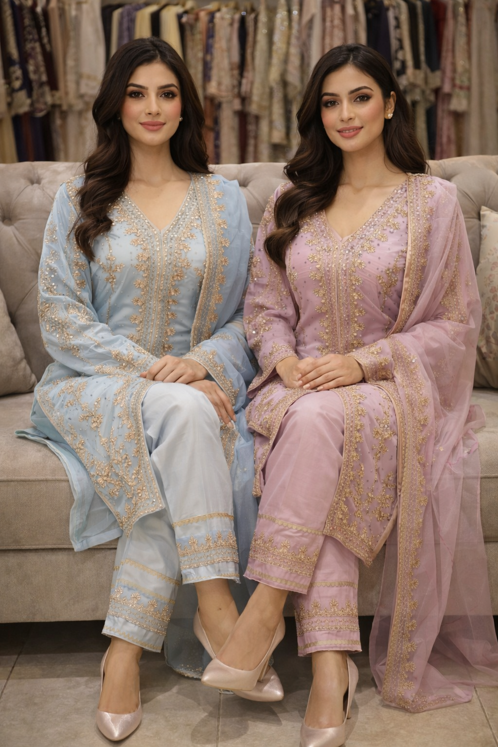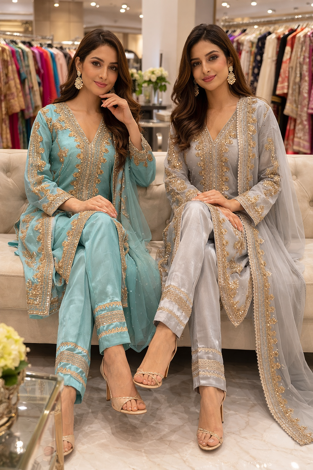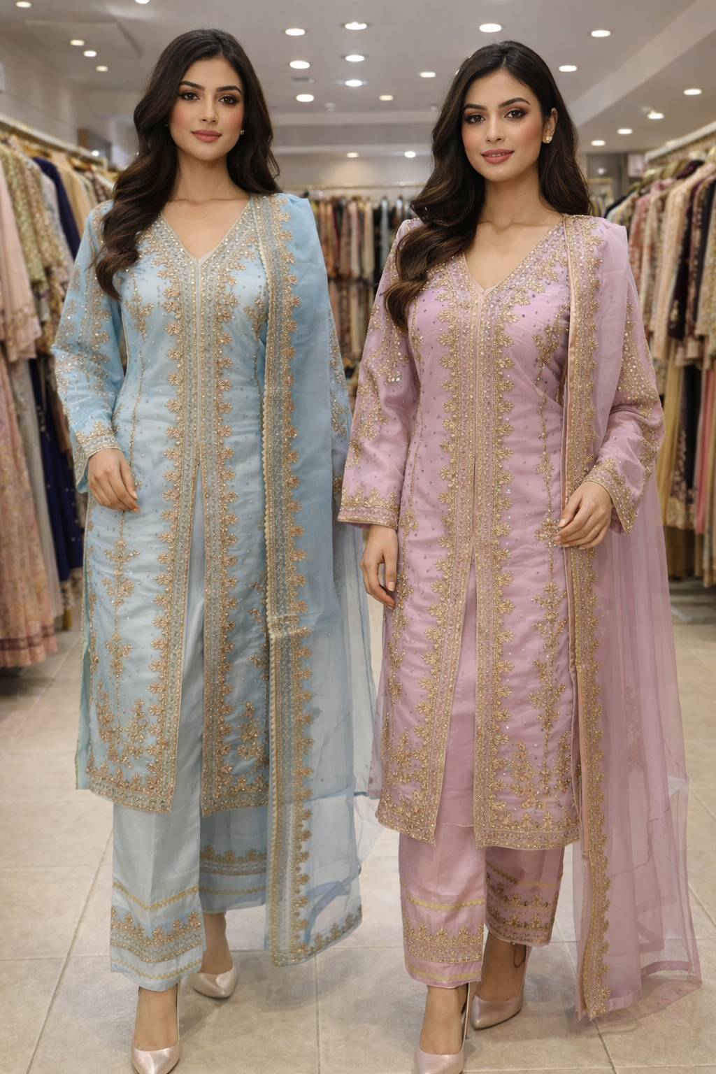 Additional Description: Introducing Falak, a breathtaking sky-blue kurta set that radiates serenity and timeless charm. Crafted with a flowing silhouette, this ensemble is adorned with intricate resham, and sequin work, adding a touch of opulence to its soft, airy hue. The kurta features a delicately embroidered neckline with floral and paisley motifs, while its straight-cut design ensures a graceful drape. The full-length sleeves are beautifully embellished with intricate threadwork, creating a harmonious blend of tradition and sophistication. The hemline is enriched with finely embroidered borders, enhancing the outfit’s regal appeal. Paired with embroidered trousers and a sheer organza dupatta, Falak is completed with exquisite floral motifs, meticulously crafted in resham work.